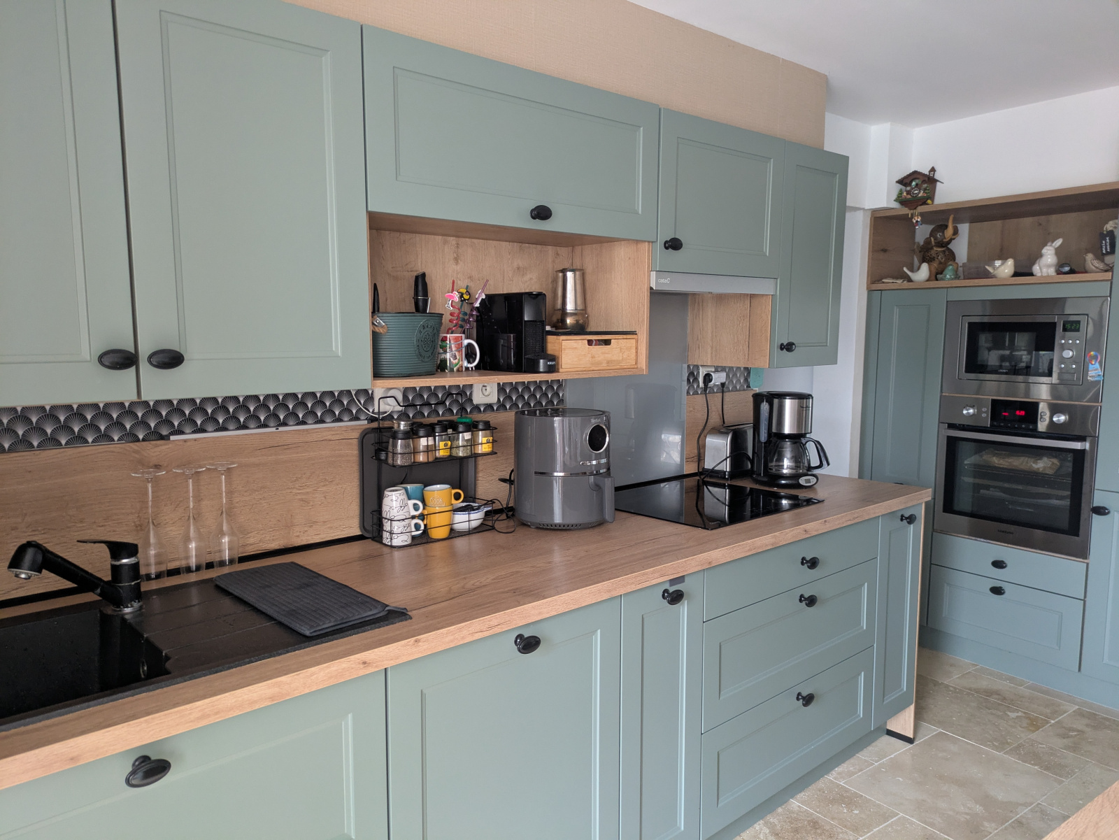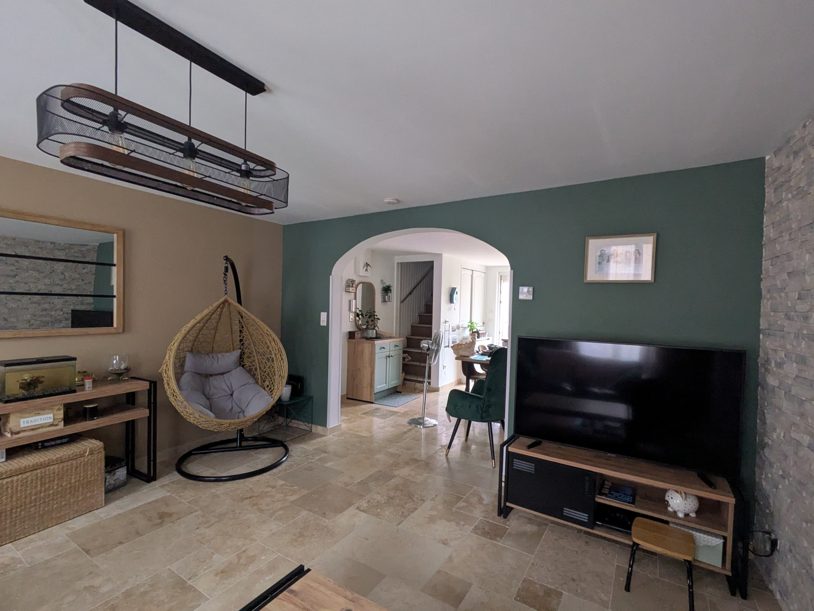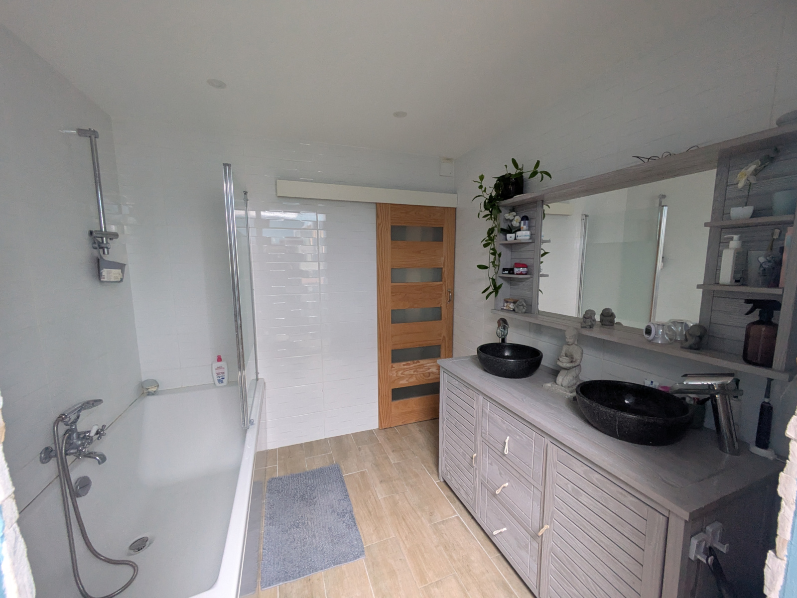 R.D.C. : Cuisine équipée (4 plaques induction, hotte, four, micro-ondes, lave-vaisselle, éléments hauts et bas, îlot central), salon, salle de bains (baignoire, double vasque), cellier, w.c., dégagement.