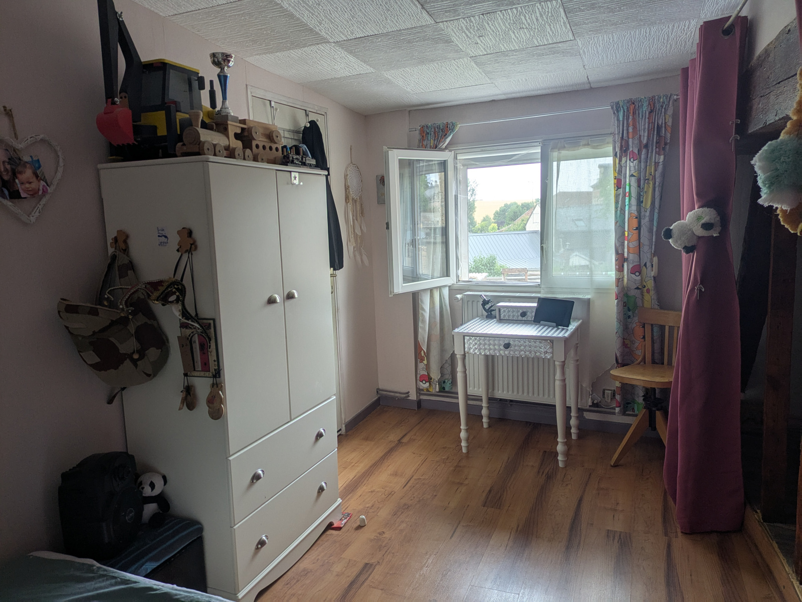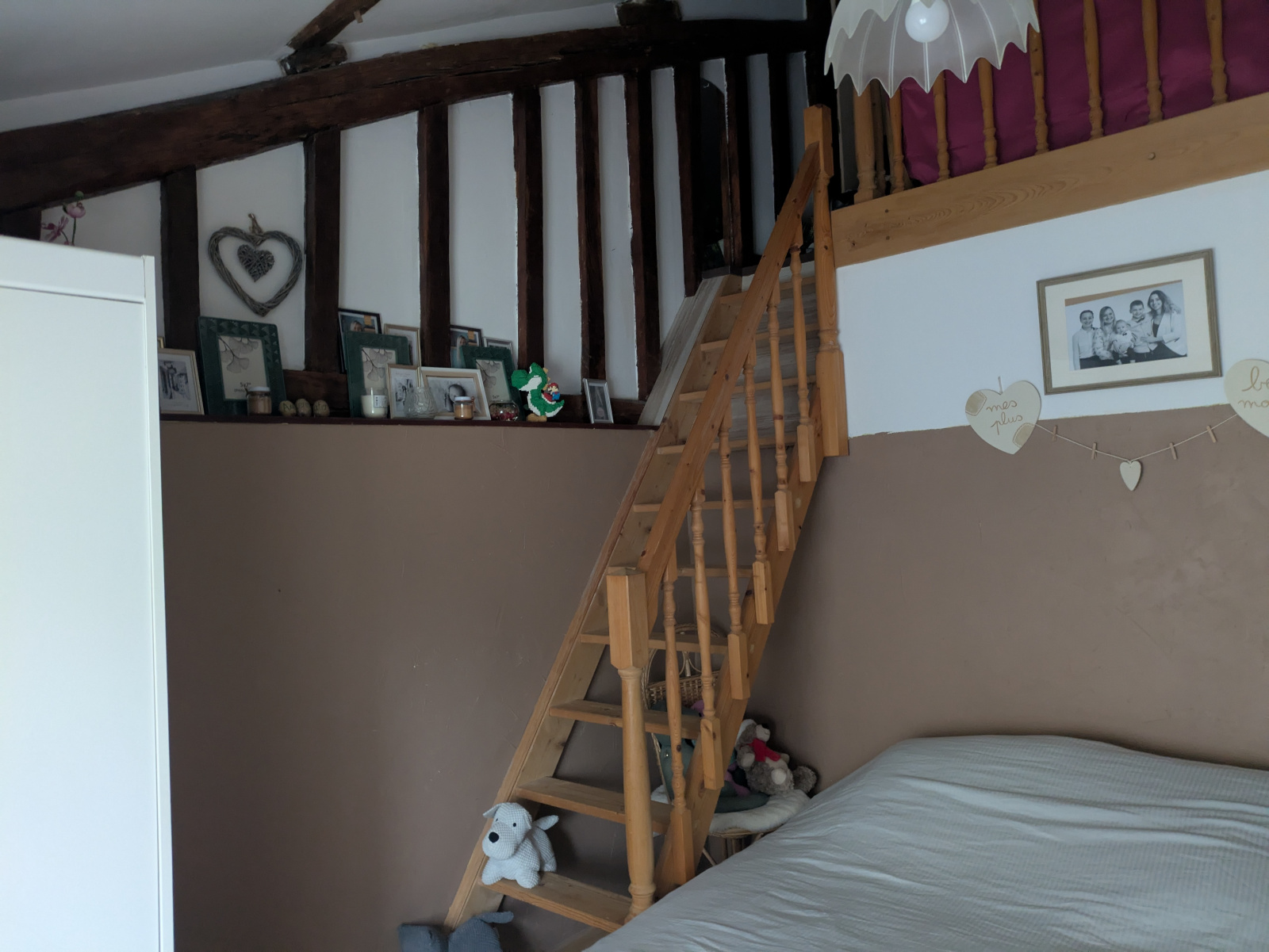 Etage : Palier, 2 chambres dont une avec rangement, chambre avec balcon, chambre avec mezzanine, salle d'eau (douche, laabo, w.c.)