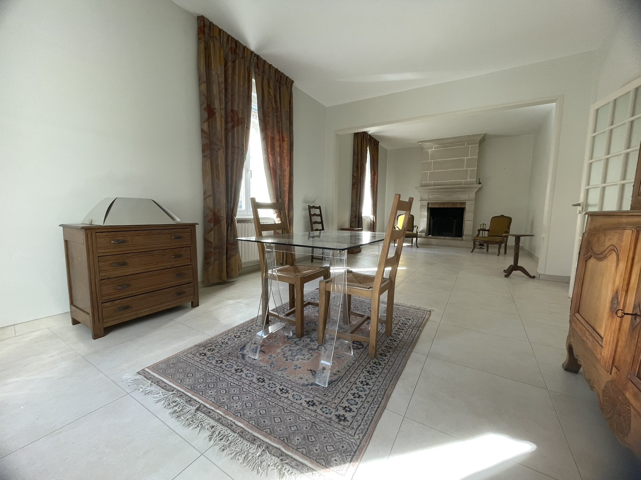 RDC : Entrée, salon/séjour avec cheminée, cuisine équipée avec coin repas, cellier, w.c. avec lave-mains